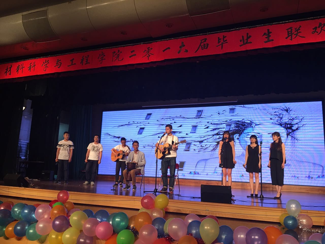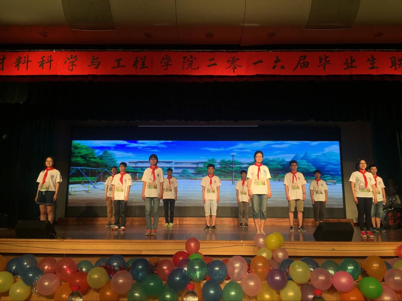 欢快的音乐声起,由2016届毕业生和老师带来的14个精彩节目让人应接不暇。其中由丁桦老师和同学们带来师生合唱《明天会更好》,毕业生辅导员孙巍巍老师、徐腾飞老师等带来的小合唱《栀子花开》,男声独唱《祝你一路顺风》,小品《你曾是少年》,相声《我的大学生活》,古筝伴舞《惊鸿》,现代舞《Bang Bang Bang》等都给人留下了深刻的印象。热情洋溢的演唱、异彩纷呈的舞蹈、令人捧腹的语言类节目,生动活泼的艺术表现诠释着青春和激情,不舍动人的情感凝结着毕业生对母校、对学院的眷恋与深情。整场联欢会古典与现代联台,欢快与伤感共存,唯美的视听盛宴和强大的激励感召相辅相成,深入贯穿“青春奋斗”、“告别前行”的主线,唱响属于材料人毕业不感伤、青春不散场的精彩旋律。