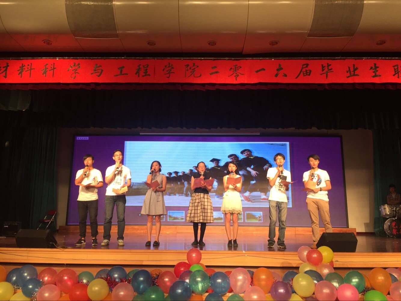 主办的“材子家人”2016届毕业生联欢会在大学生活动中心多功能厅成功举办。校团委书记闫研老师、学院院长秦高梧教授,学院党委书记张玉宝老师,副院长蒋敏教授、副院长祁阳教授,学院党委副书记兼副院长贺翔老师,校材料研究院副院长祖国胤教授,材料系副主任申勇峰教授,材料加工系主任丁桦教授、副主任班春燕教授,材料物理与化学系主任李晓武教授,部分班导师以及学生工作办公室全体老师参加了本次联欢会。