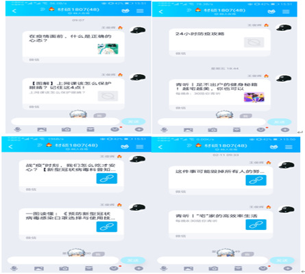 活动之初,在支部书记王俊辉的带领下,支部成员组建了多个防疫工作组,主要分为即时工作组、即时疫情信息组以及身心健康组。王俊辉强调各组需要分工明确,即时工作组主要负责每日从央视网、新闻网、新华网、央视头条、学习强国AAP等寻找疫情最新发展及防范措施等文章转发至班级群里;即时疫情信息组负责的是每天一份疫情发展走势图片或拼接成的长截图,让班级成员更好地了解当下疫情情况;身心健康组需要每天至少一份有关心理辅导或者家庭健身的小视频,以供班集体成员学习和调整自身。