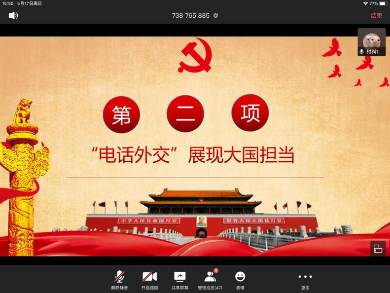 本次主题活动分为“学习党章内容”、“了解近期国际形势”、“解读国内外重大事件”三个模块。活动开始,全体成员观看了细致讲解党章内容的“领航计划-微党课”视频,同学们认真学习,仔细领会党课内容。随后,积极分子代表刘璐以“电话外交”为题,结合自己的理解对近期国际形势进行了简要分析。同学们积极发言,对当前疫情期间的国内外重大事件进行了讨论。大家纷纷表示,作为积极分子,不仅要了解党的政策主张和指导方针,更要关注时事,明辨是非,牢记实现中华民族伟大复兴的光荣使命。