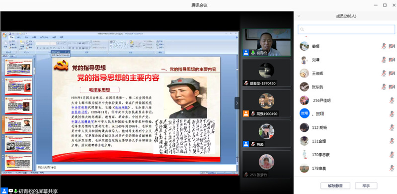 初青松为全体积极分子详细阐述了中国共产党指导思想的丰富内涵。他讲述了中国共产党在不同历史时期指导思想的发展历程,以及为什么把“马克思列宁主义、毛泽东思想、邓小平理论、‘三个代表’重要思想、科学发展观和习近平新时代中国特色社会主义思想”作为党的指导思想。他强调,党的指导思想是指导党全部活动的理论体系,是党的思想建设、政治建设、组织建设、作风建设、文化建设、制度建设和反腐倡廉建设的理论基础。初青松在课程中引经据典,多方位延伸课程知识,强烈激发起同学们的学习兴趣。课程最后,他对全体学员提出希望,希望同学们在居家期间要注重科研学习,学好本领,争取将来为党和国家做出更大贡献。