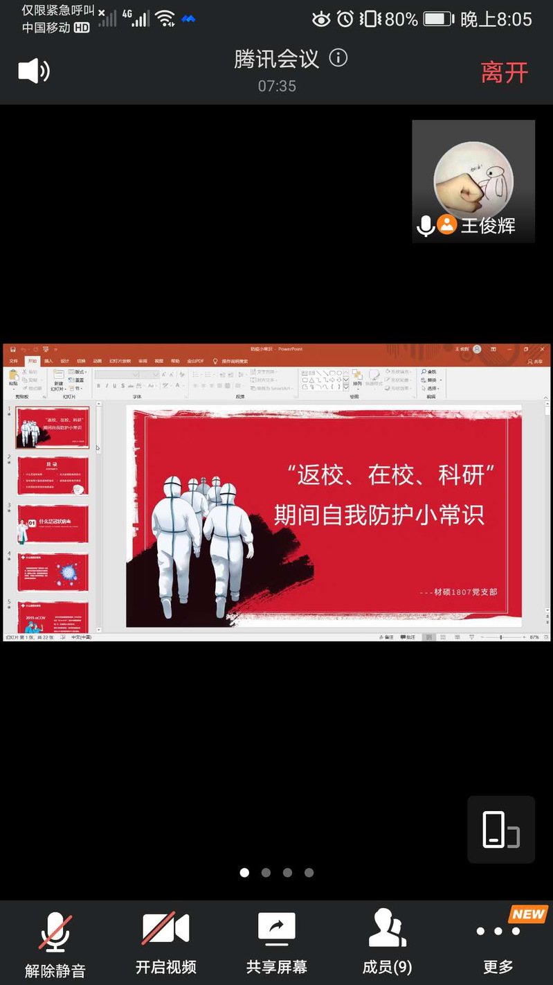 硕士1807党支部组织“战疫期间不停研,提高意识是关键”线上党日活动,支部全体成员参加此次活动。