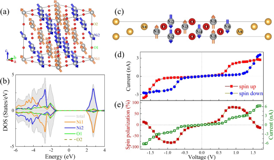 图1. (a) NiO的共线反铁磁结构,(b) NiO的态密度,(c) 设计的器件示意图,(d) 不同偏压下自旋向上和向下的电流,(e)总电流和自旋极化率的偏压关系。