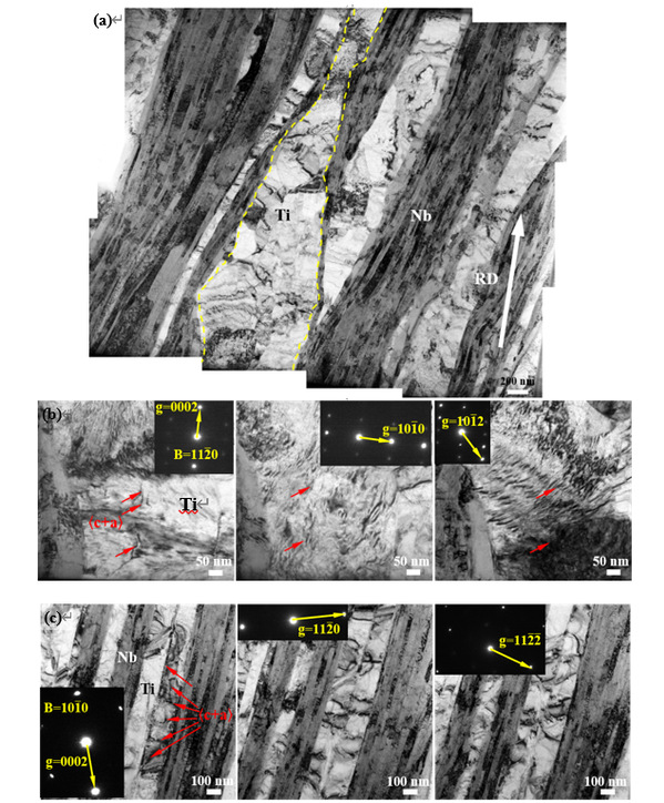 图1 经8道次叠轧Ti/Nb复合体在(a,b)拉伸变形前、(c)拉伸变形后的微观结构