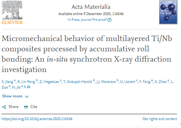 近年来,五楼自拍 贾楠教授课题组在金属层状复合材料的剪切带变形机制和形变微取向演化方面开展了系统的实验表征与数值模拟研究,主要成果发表在Acta Materialia (2013,61:4591-4606; 2014,76:238-251; 2016,111: 116-128)和Journal of Materials Science & Technology (2019, 35: 1165)等SCI期刊上。最近,该课题组在“累积叠轧制备亚微米尺度金属层状复合体的形变微结构演化和受剪切带调控的微观力学行为”方面又取得了新的研究进展,为借助微结构和织构调控来改善金属层状复合材料的力学性能以及对双相/复合材料共变形的研究提供了新的思路。相关结果以题为“Micromechanical behavior of multilayered Ti/Nb composites processed by accumulative roll bonding: An in-situ synchrotron X-ray diffraction investigation”发表在Acta Materialia上。