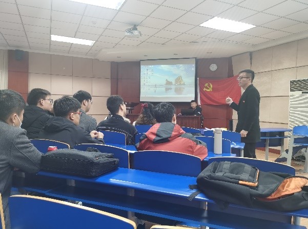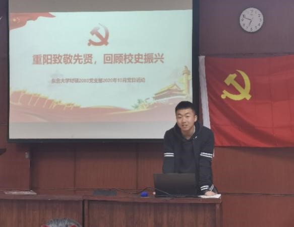 本次活动由积极分子代表王国辉主持,首先他向大家介绍了本次党日活动的主题与形式,并带领大家一起回顾了东北大学的校史。随后,支部成员一同观看了《我和我的祖国》电影片段,在没有硝烟的战斗中,老一辈科研人员克服一切艰难险阻,努力拼搏,将自身命运同国家和民族的命运紧密联系在一起,为实现国家的繁荣昌盛奉献一生。观看后同学们深有感触,大家一致认为要以老一辈的科研工作者们为榜样,不忘初心,努力学习专业知识,为实现中华民族的伟大复兴奉献自己的一份力量。